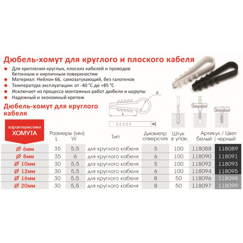 Быстрая установка: дюбель-хомуты позволяют быстро и надежно крепить кабели на стенах или потолках без дополнительных инструментов. Достаточно просверлить отверстие и зафиксировать дюбель.