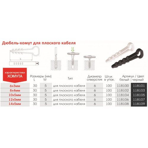 Быстрая установка: дюбель-хомуты позволяют быстро и надежно крепить кабели на стенах или потолках без дополнительных инструментов. Достаточно просверлить отверстие и зафиксировать дюбель.