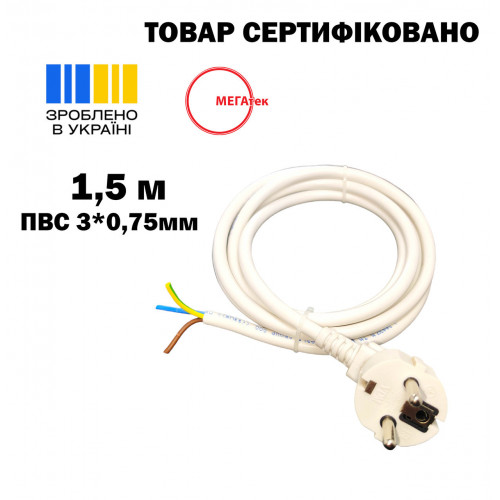 Шнур с угловой евровилкой МЕГАтек ПВС 3*0,75 белый 1,5 м Шнур с вилкой МЕГАтек ПВС Описание: Шнур с вилкой МЕГАтек ПВС – это готовый к использованию провод с литой вилкой, предназначенный для подключения бытовых электроприборов к сети переменного тока. Изготовлен из гибкого многожильного медного кабеля в двойной изоляции, что обеспечивает надежность и безопасность эксплуатации. Особенности: Гибкий провод ПВС (провод виниловый соединительный) с двойной изоляцией. Литая вилка для удобного подключения к стандартным розеткам. Устойчивость к механическим повреждениям, перегибам и износу. Технические характеристики: Марка провода: ПВС Количество жил: 2 Сечение жил: 3×0,75 мм² Материал жил: Медь Изоляция: поливинилхлорид (ПВХ) Длина шнура: 1,5м Номинальное напряжение: 220-250 В Максимальный ток: 16 А Цвет: Белый Применение: Подключение бытовых электроприборов (осветительных приборов, обогревателей, вентиляторов и т.п.) Использование в электромонтажных работах Замена поврежденных сетевых шнуров Достоинства: ✔ Высококачественные материалы для длительного срока службы ✔ Гибкость и прочность, стойкость к изломам ✔ Простота в использовании – готов к подключению ✔ Надежный контакт и безопасная эксплуатация