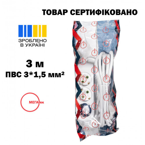 Удлинитель МЕГАтек 3 гнезда 3 м с/с ПВС 3*1,5 МТП-0107-1005