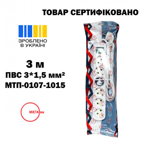 Удлинитель МЕГАтек с выключателем 6 гнезд 3 м с/с ПВС 3*1,5 МТП-0107-1015 Производитель: МЕГАтек Тип: удлинитель Количество розеток: 6 шт Длина шнура: 3 м Напряжение: 220 В Сечение жил: 3x1.5 мм² Напряжение: 220~250В Номинальный ток: 16А Удобное подключение провода Класс защиты IP20 Заземление: Есть Наличие кнопки выключателя: Есть Произведено в Украине Представительство в каждом месте Украины Товар сертифицирован Удлинитель на колодке позволяет подключать устройства в местах удаленных от стационарных розеток в бытовых условиях эксплуатации. Предназначен для использования в электрической сети 220 В для питания устройств с максимальной суммарной мощностью погрузки 3,5 кВт. Корпус имеет класс защиты IP20. Удлинитель на колодке МЕГАтек станет отличным помощником в доме, офисе.
