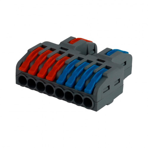Альтернативным способом монтажа является применение быстрозажимных клеммников. Клеммные зажимы "Ваго" имеют целый ряд неоспоримых преимуществ при выполнении электромонтажных работ:Возможность соединения алюминиевых и медных проводов. Соединение проводов разных диаметров от 0,5 до 4,0 кв. мм.Использование многожильных проводов.Номинальный ток до 32А. Соединение до восьми проводов в одной группе. Быстрый и удобный монтаж без применения специальных инструментов.Изолированное электробезопасное соединение. К омпактный размер клеммника. Монтаж зажимов выполняется вручную: Концы проводов зачищаются на длину 10 мм.Поднимаются рычажки оранжевого цвета на клеммнике "Ваго", зажим открывает отверстие пружинного контакта. Зачищенные концы проводов до упора вставляются в отверстия клеммы.Рычажки опускаются в исходное положение, отпуская пружину контакта и зажимая провод.