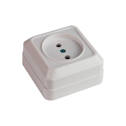 Розетка белая накладная одинарная без заземления предназначена для внутренних сетей переменного тока, напряжением до 250В. Контактная группа – латунь. Количество вводов в гнезде: 2.