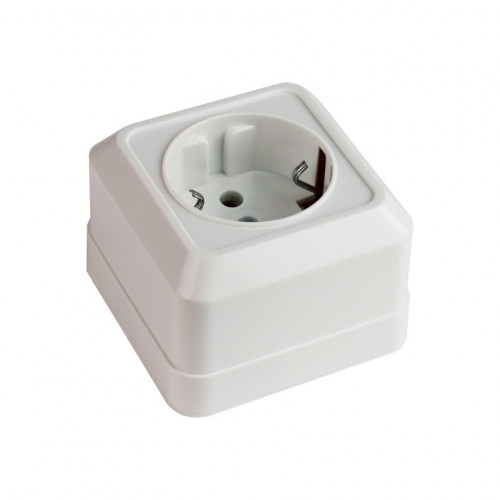 Розетка белая накладная одинарная с заземлением предназначена для внутренних сетей переменного тока, напряжением до 250В. Контактная группа – латунь. Количество вводов в гнезде: 2.