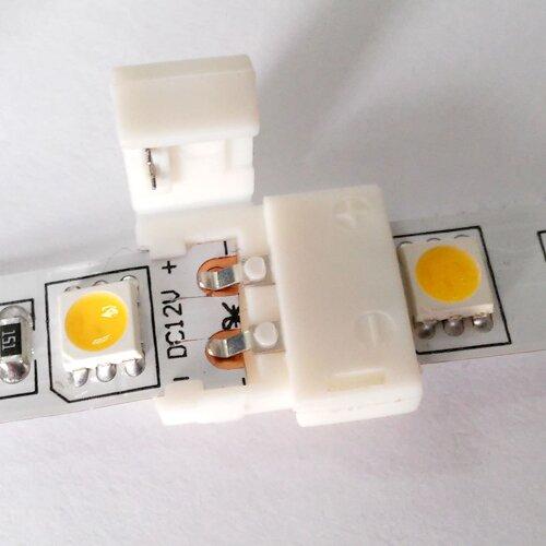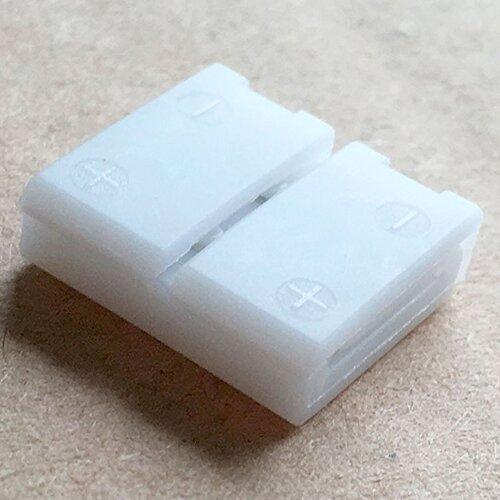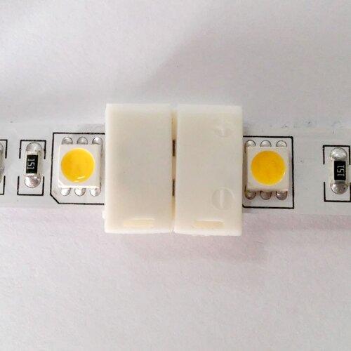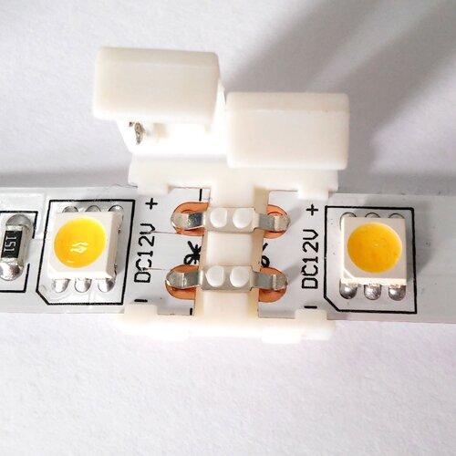 Этот коннектор типа «зажим-зажим» используется для соединения отрезков светодиодных лент стык-в-стык. Изделие представляет собой клипсу с четырьмя контактами, имеющую ширину 10 мм.