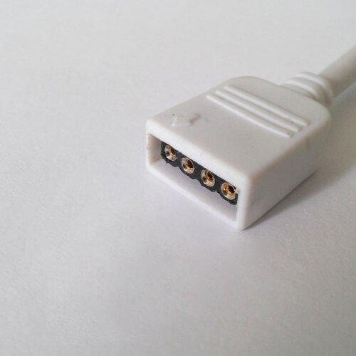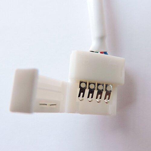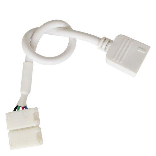 Данный коннектор предназначен для соединения отрезков светодиодных лент. Он состоит из четырехконтактной клипсы, проволоки и 4 зажимов типа «папа». Изделие имеет ширину 10 мм и подходит для гибких плат типа RGB.