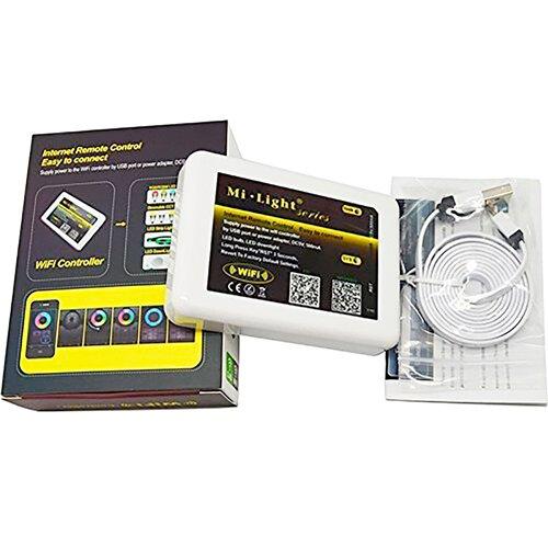 Этот RGB-контроллер применяется для управления подсветкой из светодиодных лент. Он рассчитан на напряжение 12 В постоянного тока и работу с четырьмя зонами. Связь между устройством и световым контуром поддерживается с помощью Wi-Fi.