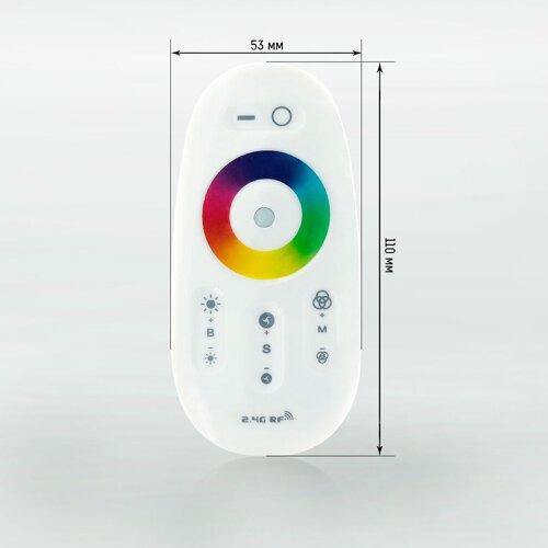 Корпус изделия выполнен из пластика. Он имеет размеры 110х73х25 мм. В комплекте с ним поставляется пульт дистанционного управления, передающий сигналы с помощью радиочастот. На нем расположен набор кнопок и сенсорное цветовое кольцо для плавного изменения цвета.