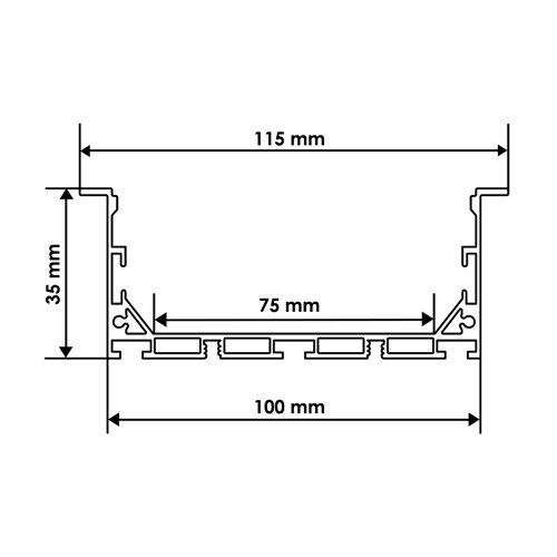Этот широкий профиль для светодиодной ленты изготовлен из алюминия и рассчитан на врезной монтаж. Размеры сторон –ndash; 35х100 мм. Изделие поставляется в виде отрезков протяженностью 1 метр. Данная модель имеет анодированное покрытие.