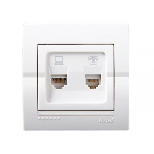 Розетка компьютерная + телефон (RJ45+RJ11) белая ТМ LEZARD серии Deriy выполнена из негорючего, износостойкого к царапинам материала (PC) поликарбонат, который сохраняет свой блеск и первоначальный цвет на протяжение долгого времени, даже при попадании прямых солнечных лучей. Элементы, проводящие ток, состоят из фосфористой бронзы (94% Cu, 6% Sn), что обеспечивает слабый нагрев проводников. Контактная группа закрыта негорючей поликарбонатной накладкой, предотвращающей возникновение искры. Контактный блок выполнен из прочного негорючего материала PBT, способного выдержать температуру 850 С и является ударостойким. Используются для подключения и передачи данных сети и подключения телефона к сети. Жесткий, нержавеющий каркас розетки из металла толщиной 1 мм обеспечит равномерное прилегание изделия к стене, а также имеет направляющие пазы для группового монтажа. что обеспечивает его удобную подводку.