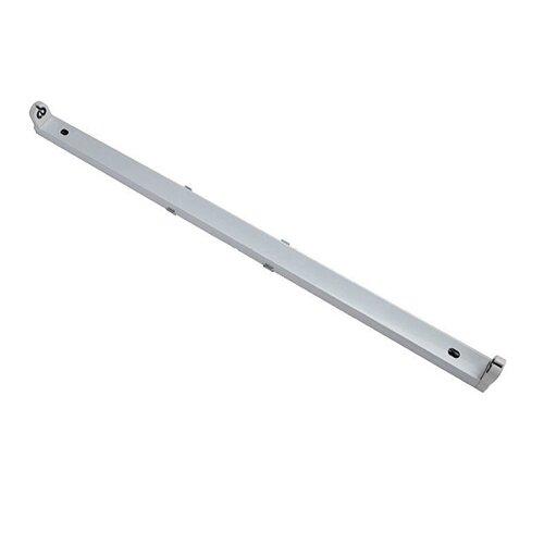 Данный линейный светильник рассчитан на установку продолговатых ламп форм-фактора Т8. Корпус изделия сделан из металла, из торцов присутствуют пластиковые элементы. Модель подразумевает накладной монтаж, плафон отсутствует. Цвет элементов – белый и серебристый. Класс защиты устройства –ndash; IP20.