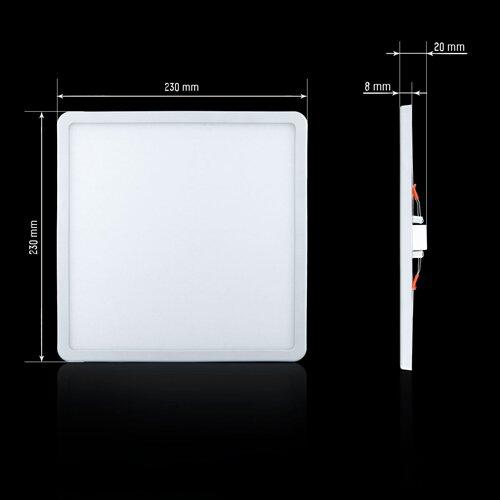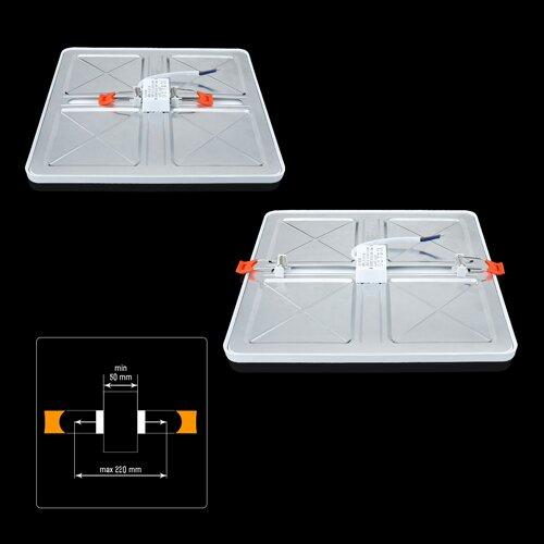 Тон свечения прибора – нейтральная, соответствующая цветовая температура равна 5000 К. Электрическая мощность составляет 24 Вт, что эквивалентно свечению вольфрамовой лампочки на 216 Вт. Световой поток от устройства достигает 1850 лм, а светоотдача получается 77 лм/Вт. Индекс цветопередачи не опускается ниже 80 ед., а угол разлета лучей равен 140°. Устройство должно габариты 230х230х20 мм, посадочные размеры регулируются от 50 до 220 мм. Материал корпуса – ABS-пластик, рассеиватель светильника – матовый. Прогнозируемый срок эксплуатации прибора – 30 000 часов работы.
