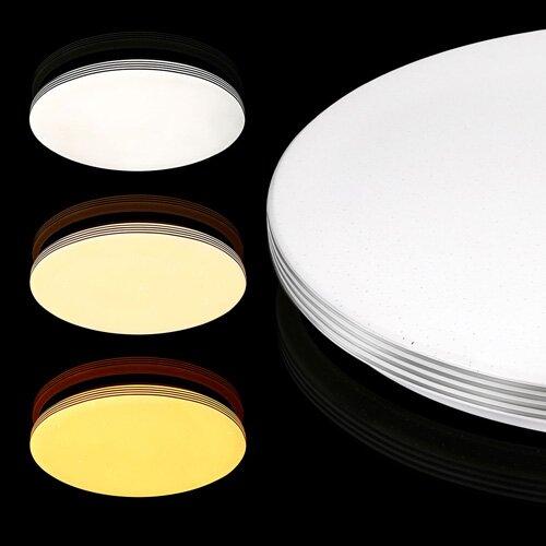 Данный светодиодный смарт-светильник имеет круглую форму и окрашен в белый цвет. Мощность изделия составляет 80 Вт, что эквивалентно 720 Вт в пересчете на лампу накаливания. Светильник излучает световой поток в 6400 лм, обеспечивая углы разлета лучей до 170°С. и светоотдачу 80 лм/Вт. Оттенок свечения может колебаться от 3000 К (теплое) до 6000 К (холодное), индекс цветопередачи – 70 единиц. Напряжение питания – 176-265 В. Арматура изделия изготовлена из металла, плафон – из поликарбоната. Класс защиты – IP20. В комплекте со светильником поставляется пульт управления. Также у данной модели предусмотрена возможность дымирования.
