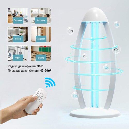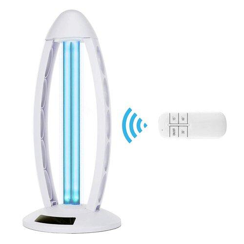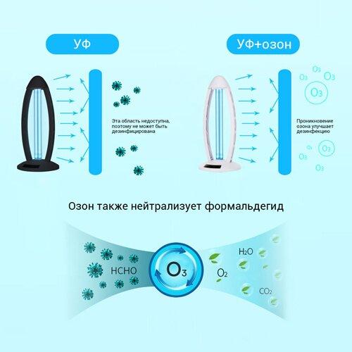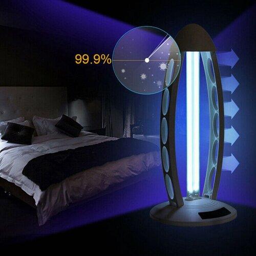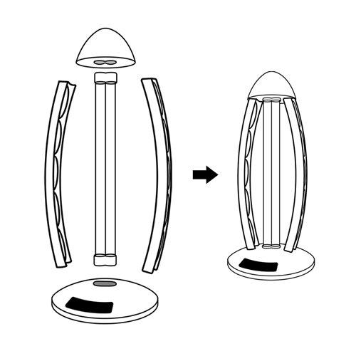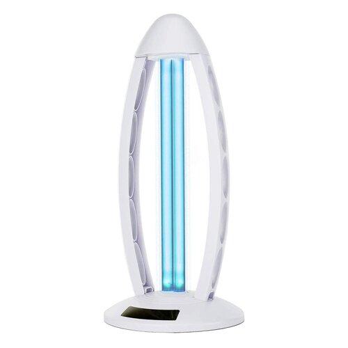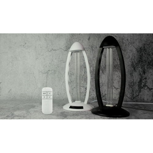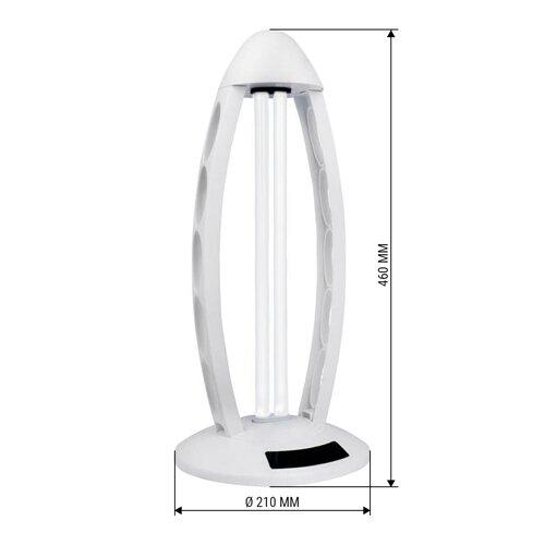 Светильник имеет мощность 38 Вт, что на 30% больше мощности моделей аналогичного форм-фактора. Высота изделия – 46 см, диаметр основания – 21 см. Благодаря тому, что светильник не требует специального крепления или настенного монтажа, углы рассеяния лучей составляют 360°С. Эффективная площадь дезинфекции прибора – 40–50 кв. м.