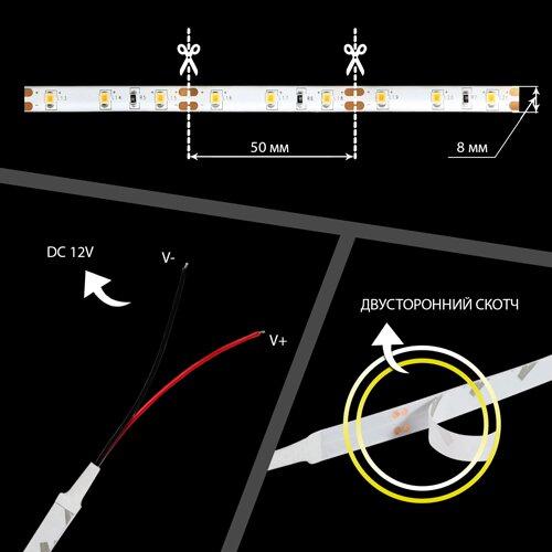 Энергопотребление ленты составляет 4,8 Вт/м, количество диодов в одном метре – 60 шт. Цветовая температура изделия – 2800-3200К, углы свечения – 120°. Срок службы ленты оценивается в 20 000 часов, а производитель дает гарантию на изделие 12 месяцев.