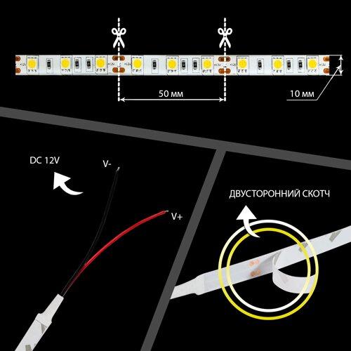 Энергопотребление ленты составляет 14,4 Вт/м, количество диодов в одном метре – 60 шт. Цветовая температура изделия – 6000-6500К, углы свечения – 120°. Срок службы ленты оценивается в 20 000 часов, а производитель дает гарантию на изделие 12 месяцев.