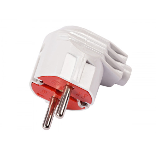 Вилка с заземлением угловая белого цвета европейского стандарта. Корпус изготовлен из высококачественного пластика. Провода легко подключаются и не выпадают благодаря специальному зажиму на конце вилки.