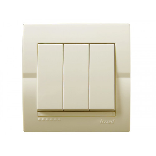 Выключатель трёхклавишный крем ТМ LEZARD серии Deriy выполнен из негорючего, износостойкого к царапинам материала (PC) поликарбонат, который сохраняет свой блеск и первоначальный цвет на протяжение долгого времени, даже при попадании прямых солнечных лучей. Элементы, проводящие ток, состоят из фосфористой бронзы (94% Cu, 6% Sn), что обеспечивает слабый нагрев проводников. Контактный блок выполнен из прочного негорючего материала PBT, способного выдержать температуру 850 С и является ударостойким, контакты выключателя покрыты серебром (AgNi90/10).Жесткий, нержавеющий каркас выключателя из металла толщиной 1 мм обеспечит равномерное прилегание изделия к стене, а также имеет направляющие пазы для группового монтажа. что обеспечивает его удобную подводку.о фиксируется в посадочном месте, благодаря горизонтальному расположению заострённых крепежей